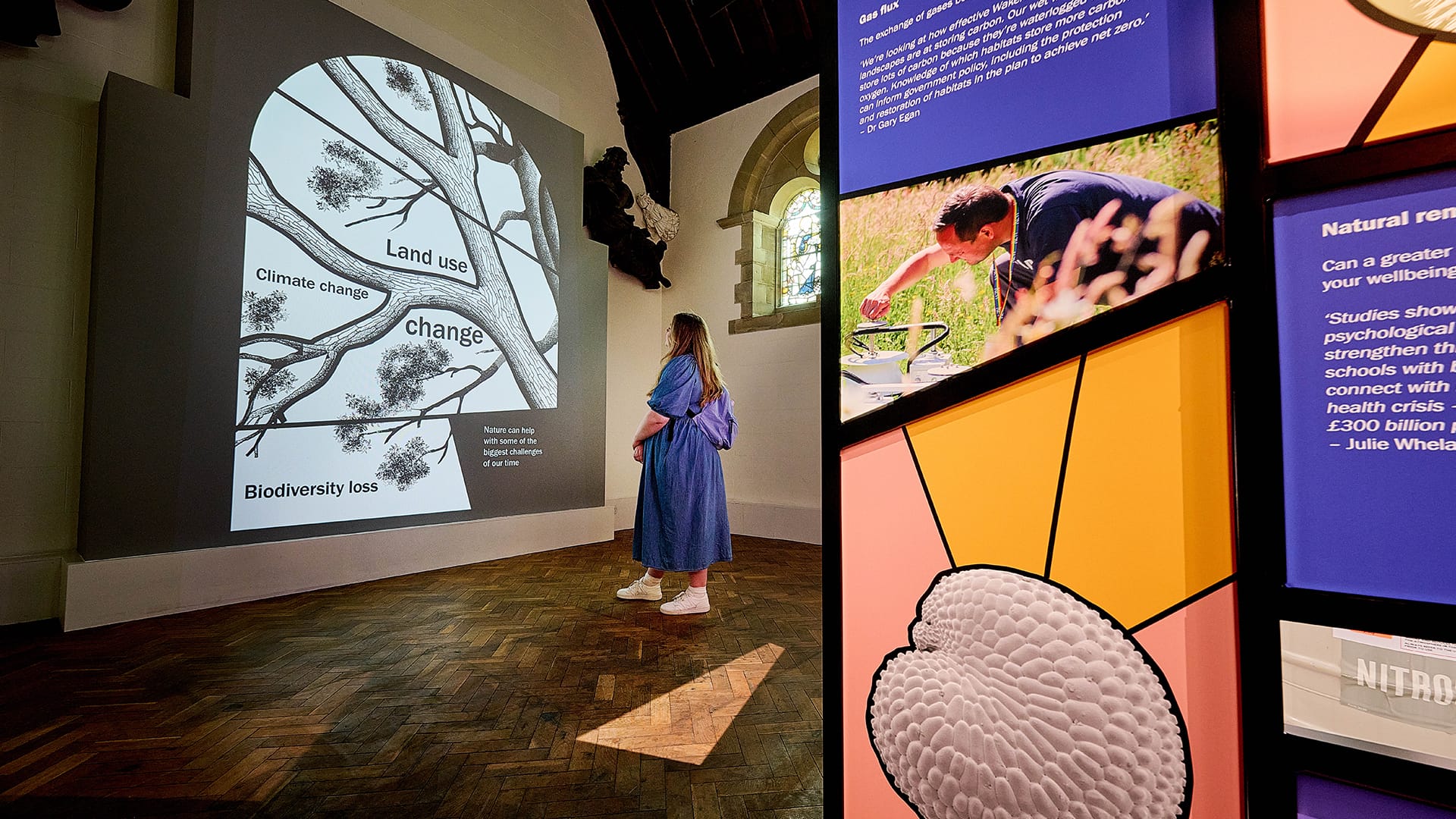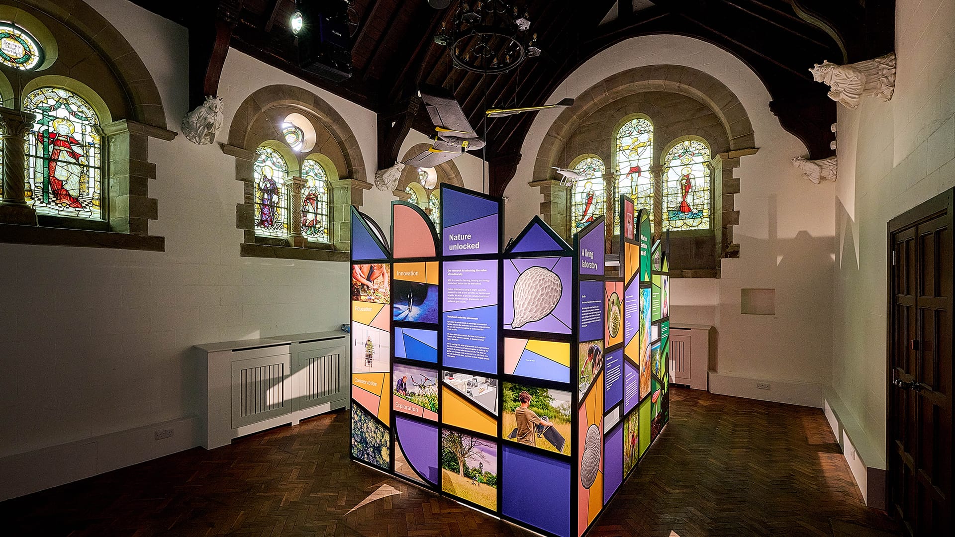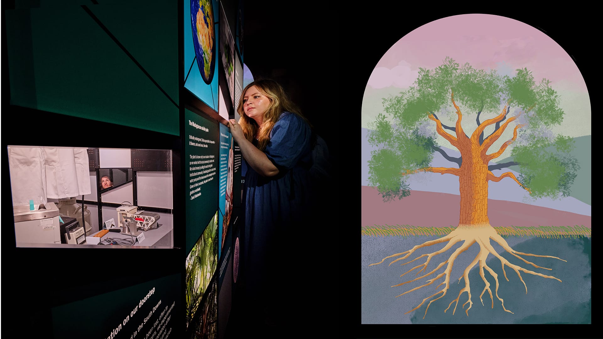 To mark the 25th anniversary of the Millennium Seed Bank, Kew commissioned Designmap to create permanent interpretation within Wakehurst Mansion, where the seed bank was founded. The project spans two historic rooms - the Chapel and the Billiard Room - telling the story of the MSB’s origins, scientific purpose and global impact. In the Chapel, a sculptural illuminated centrepiece inspired by stained glass reveals early seed-banking tools, layered interpretation and a large-scale hand-illustrated projection exploring Kew’s Nature Unlocked research.